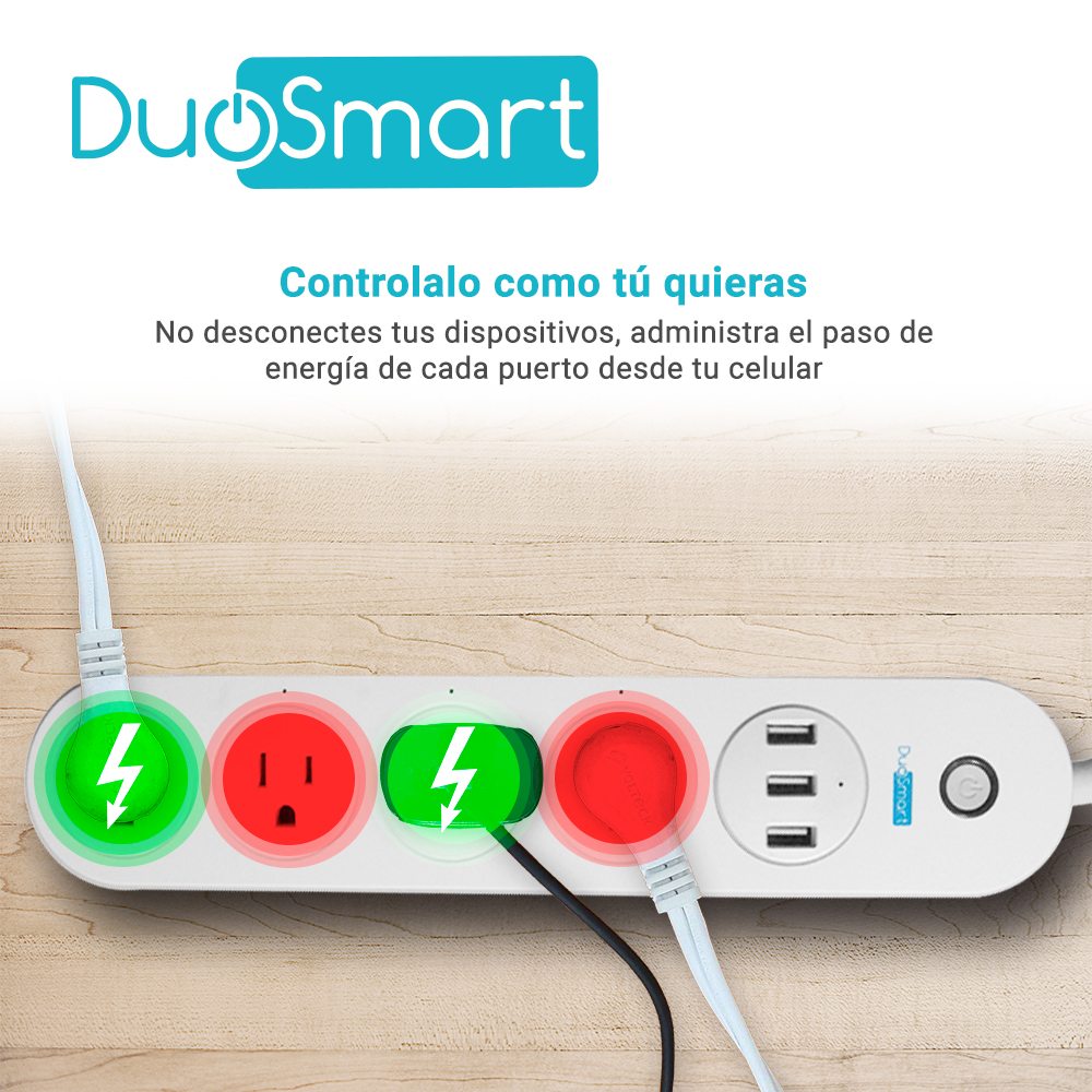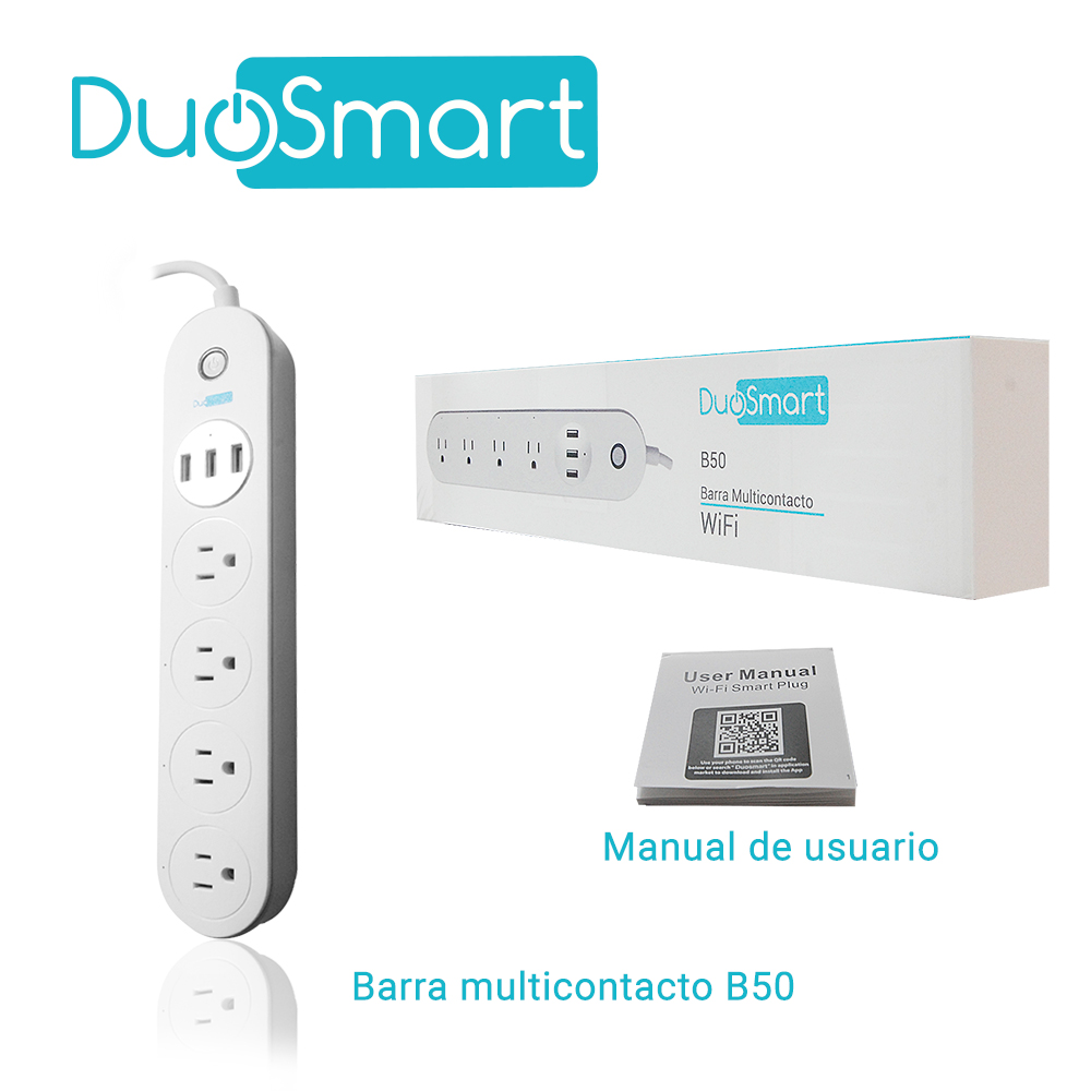 BARRA MULTICONTACTO WIFI DUOSMART B50 CON CONTROL INDEPENDIENTE DE CONTACTOS Y USB. La barra de multicontactos Duosmart B50, es un dispositivo que nos permite adentrarnos en el mundo de la automatización. Maneja este dispositivo desde la palma de tu mano, con la aplicación móvil de Duosmart, administra tus contactos de manera independiente(excepto los puertos USB, se encienden o apagan los 3 al mismo tiempo), tú decides cuando encenderlos o apagarlos . Además podrás crear escenas que ayudarán a determinar en que momento accionar los contactos, como por ejemplo: Programa una hora de encendido y apagado, para automatizar tus equipos que requieren carga periódica de energía, ya no más baterias de celular dañadas por dejarla conectada toda la noche. Apaga tus equipos sin desconectarlos fisicamente. Su diseño con contactos en forma horizontal te permitirán colocar diferentes tipos de fuentes y adaptadores sin tener que preocuparse por el espacio de los contactos, además de contar con un cable de alimentación de 2 mts de largo, lo cual facilitará su instalación. No cuenta con orificios para montaje en pared, se puede colocar utilizando cinta doble cara.