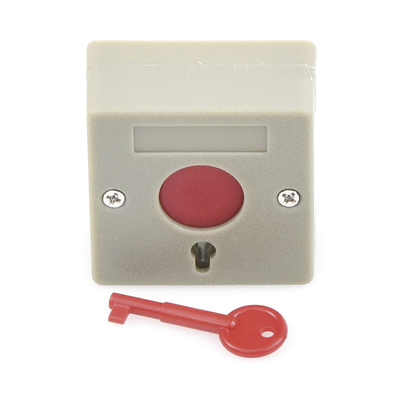 Botón de pánico para uso en casos de emergencia. Puede utilizarse para activar un sistema de alarma, sirena o puertas de emergencia. Restablecimiento con llave. Tamaño compacto para fácil instalación.