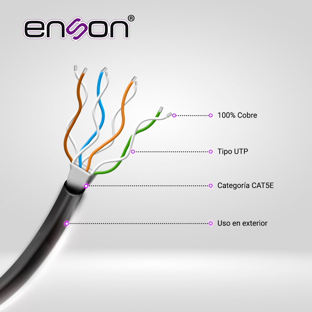 CABLE UTP CAT5E ENSON 13151B305 DOBLE FORRO SERIE PRO-II CALIBE 24 AWG 100% COBRE BOBINA DE 305 METROS FORRO PE COLOR NEGRO Y PVC COLOR GRIS USO EXTERIOR RECOMENDADO PARA CCTV, VIDEO IP Y REDES BASE 10,100