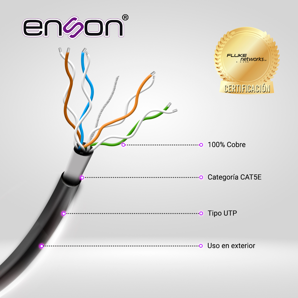 EPRO-CAT5E-OUGEL ENSON Cable UTP categoria 5E 100% Cobre uso exterior con gel. Los cables UTP (Unshielded Twisted Pair) son cables utilizados principalmente en redes de comunicación, como las redes Ethernet, para transmitir datos. Estos cables suelen contener gel para protegerlos de la humedad y el agua. Cumple con estandard ANSI/TIA-568-C.2 100% Cobre Conductor calibre 24 AWG Con gel Con ripcord Material PVC Color Negro