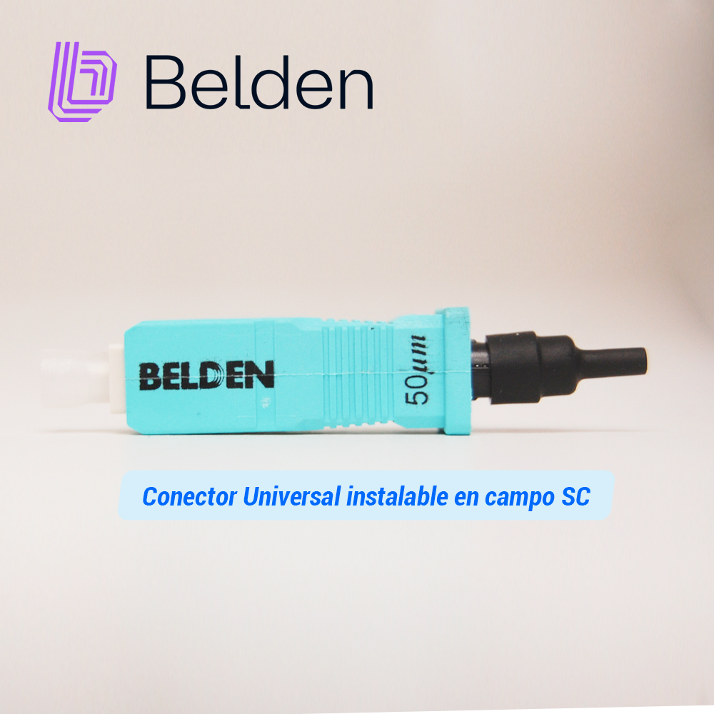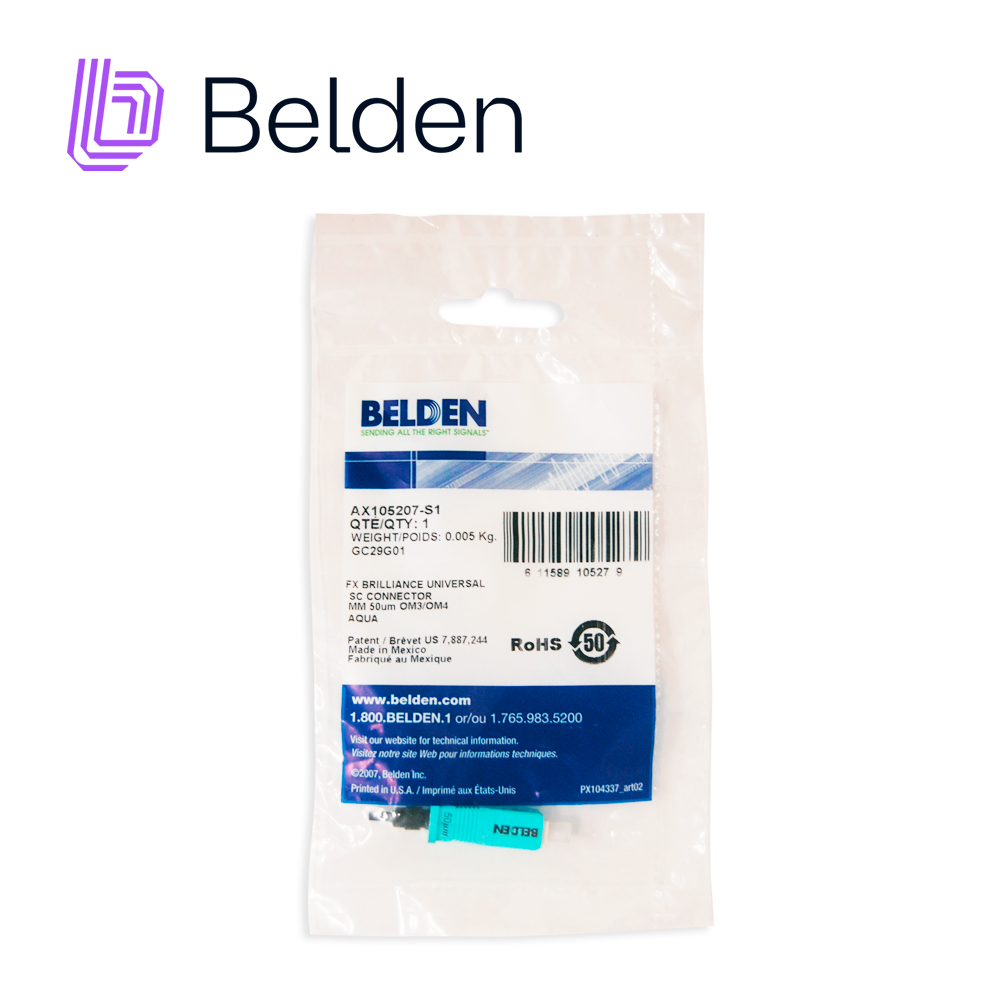 AX105207-S1 BELDENFX Brilliance Universal SC Conector instalable en campo, Multimodo, OM3-OM4, Aqua Housing, 1 / Paquete, con soporte para 250 micras (con kit de desprendimiento), 900 micras, 2 mm y 3 mm de fibra (con botas encamisadas). Incluye una funda de 900 micras, otros accesorios (kit de desprendimiento y botas con camisa) que se venden por separado. Tipo de fibra Multimodo OM3 Tipo de conector SC Pérdida máxima de inserción: 0.50 dB Pérdida de inserción típica: 0.20 dB Reflectancia mínima a 1550nm: -30 dB Estilo de terminación: Mecánico Compatibilidad de interconexión: Cumple con TIA / EIA-604-3