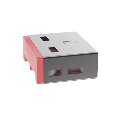 El dispositivo de bloqueo USB tipo A SmartKeeper protege los puertos USB-A para limitar o evitar el acceso no autorizado mediante la adición de una capa física. También puede proteger el puerto del polvo y los residuos o de daños causados ​​por objetos extraños. Solo se puede quitar con la llave maestra SmartKeeper. El dispositivo es de color rojo.