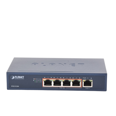 | LED Indicators | PoE In Port 10/100 LNK/ACT (Orange), 1000 LNK/ACT (Green) PoE Out Port 1 to Port 4 10/100 LNK/ACT (Orange), 1000 LNK/ACT (Green) PoE-in-Use (Orange) PoE Max. (Orange) |