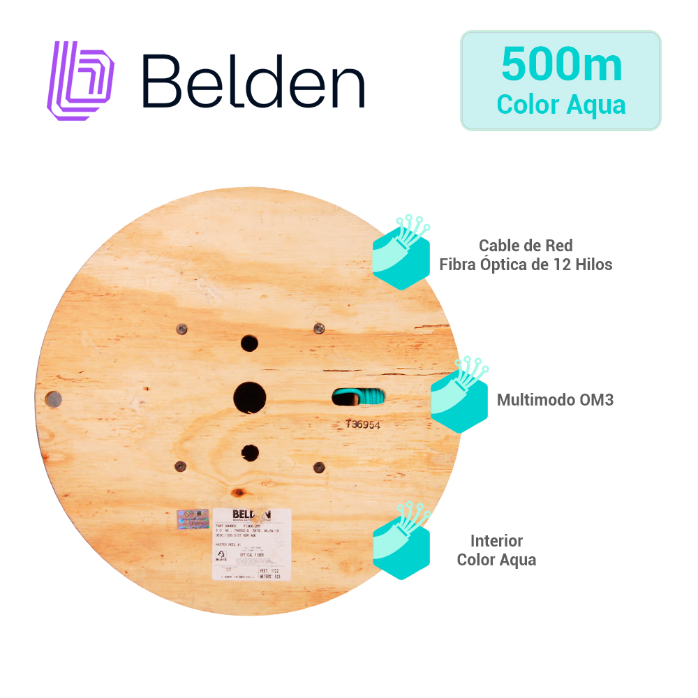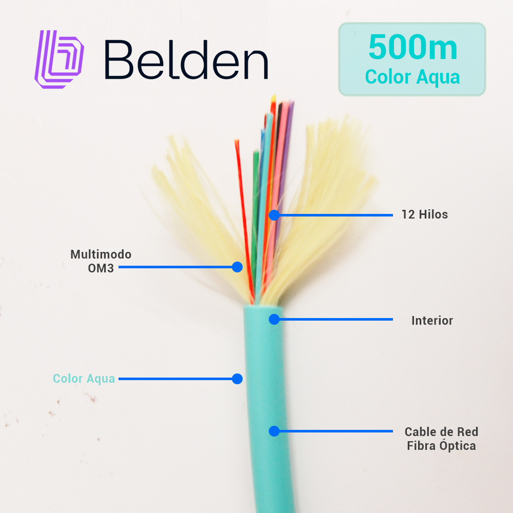FIBRA OPTICA INTERIOR MULTIMODO BELDEN FI3D012R9 12HILOS OM3 1640FT 500 MTS COLOR AQUA EN CARRETE - DISPONIBLE EN CARRETE DE 1640FT Y MAYORES