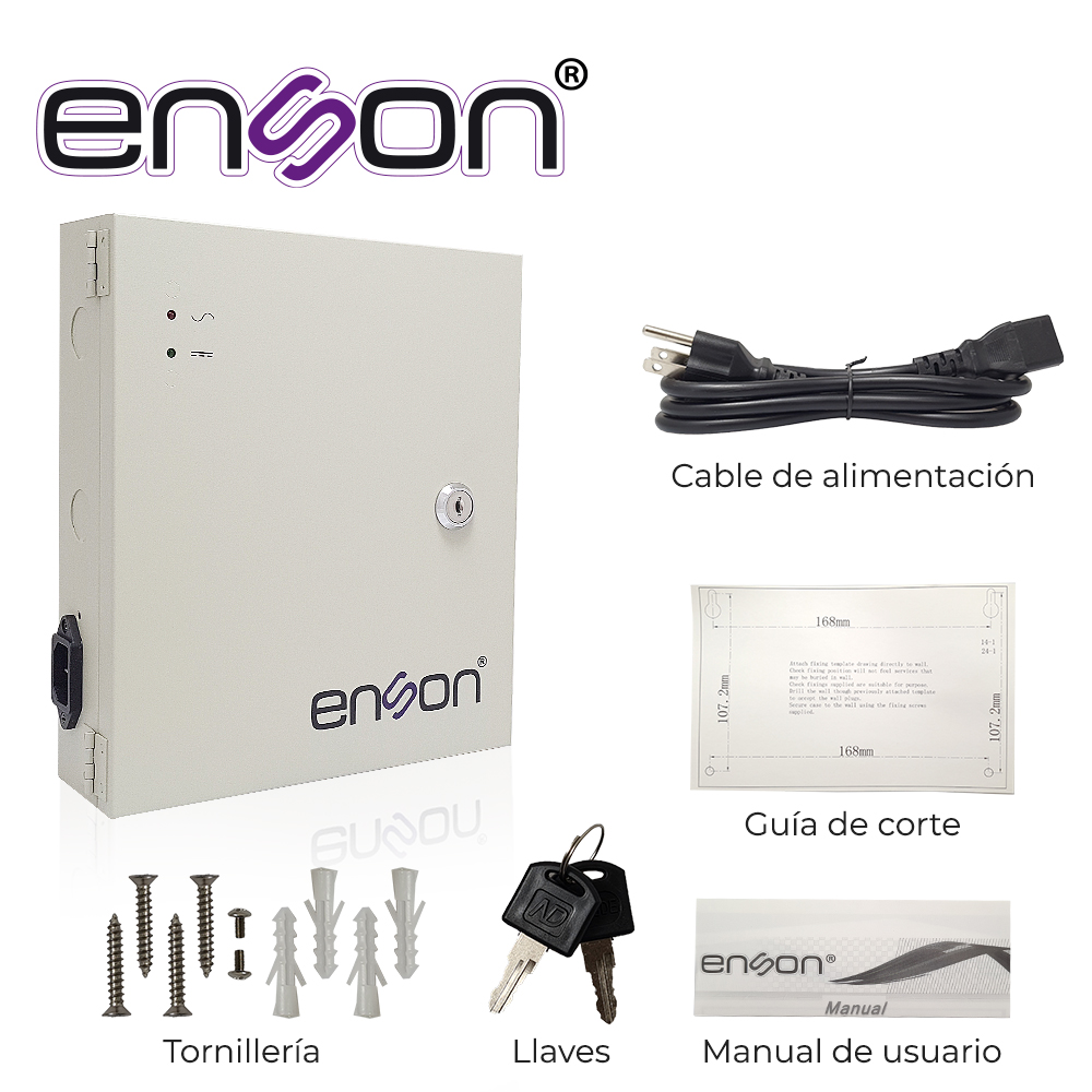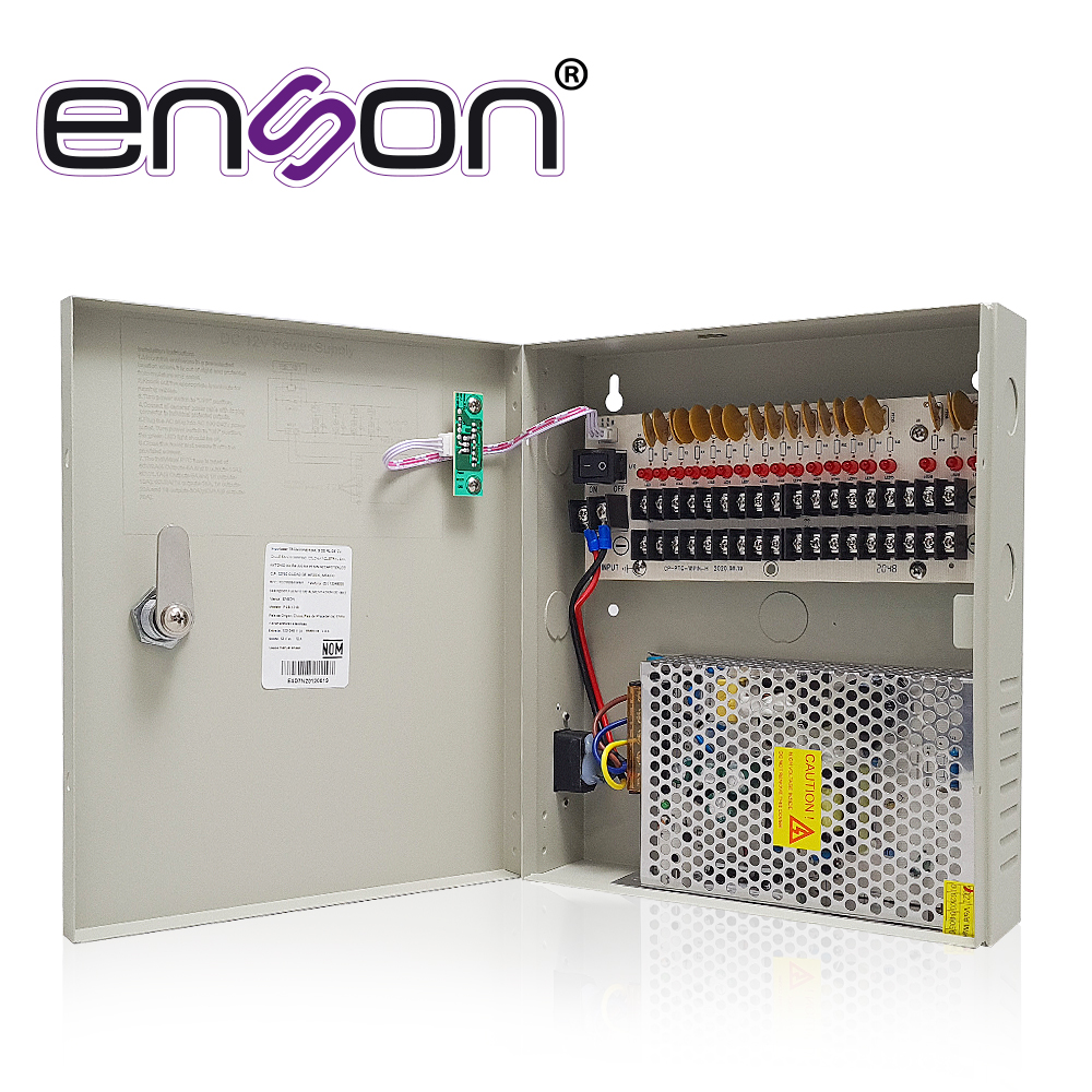 ENSON REG. PSB-1218La fuente de poder ENSON PSB-1218 es una potente fuente de poder de 10Ampers ideal para conectar hasta 18 cámaras o controles de acceso.Cuenta con 18 salidas de corriente con fusibles individuales tipo PTC autorrecuperables, que no requieren ser cambiados o sustituidos ya que al originarse un corto se restablecen de forma automática.