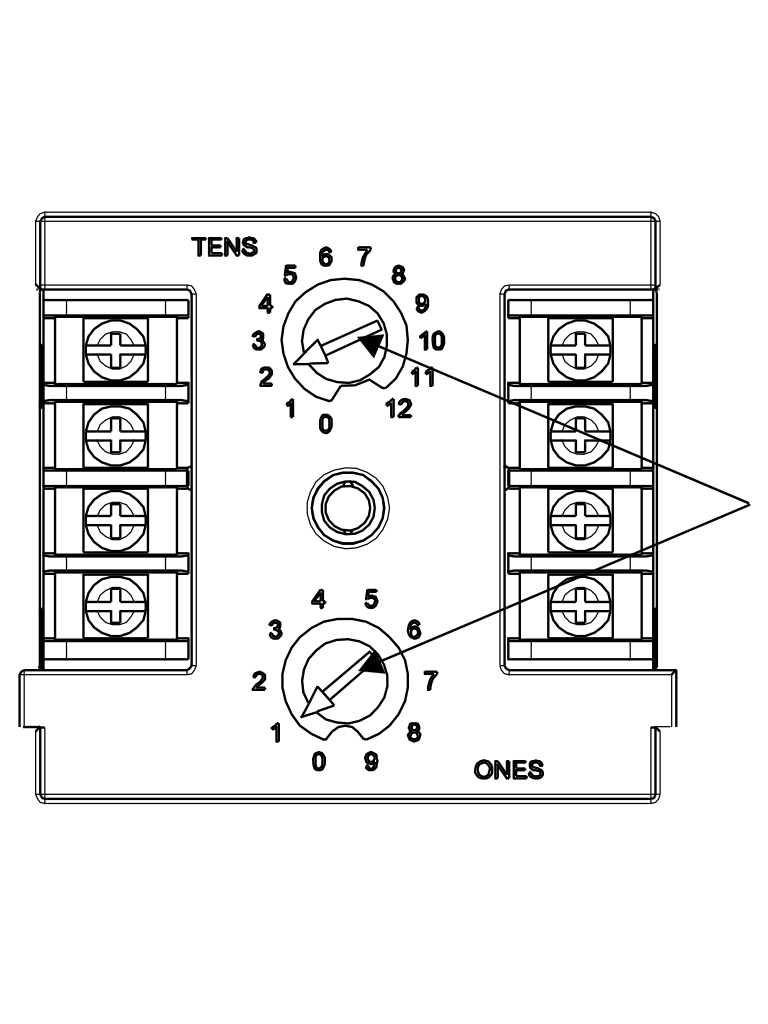 Utilice un destornillador para ajustar los dos interruptores giratorios en la parte frontal del módulo. Configure el interruptor giratorio TENS (0 a 12) para el dígito de las decenas y el interruptor giratorio UNOS para el dígito 0 al 9.