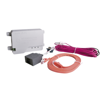El nuevo convertidor Ethernet MeterBus (modelo: EMC-1). Permite la conectividad de red basada en IP y de Internet a cualquier producto de Morningstar que cuente con un puerto MeterBus existente (RJ-11) que lo incluyen los siguientes controladores: