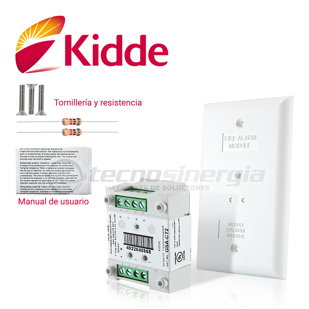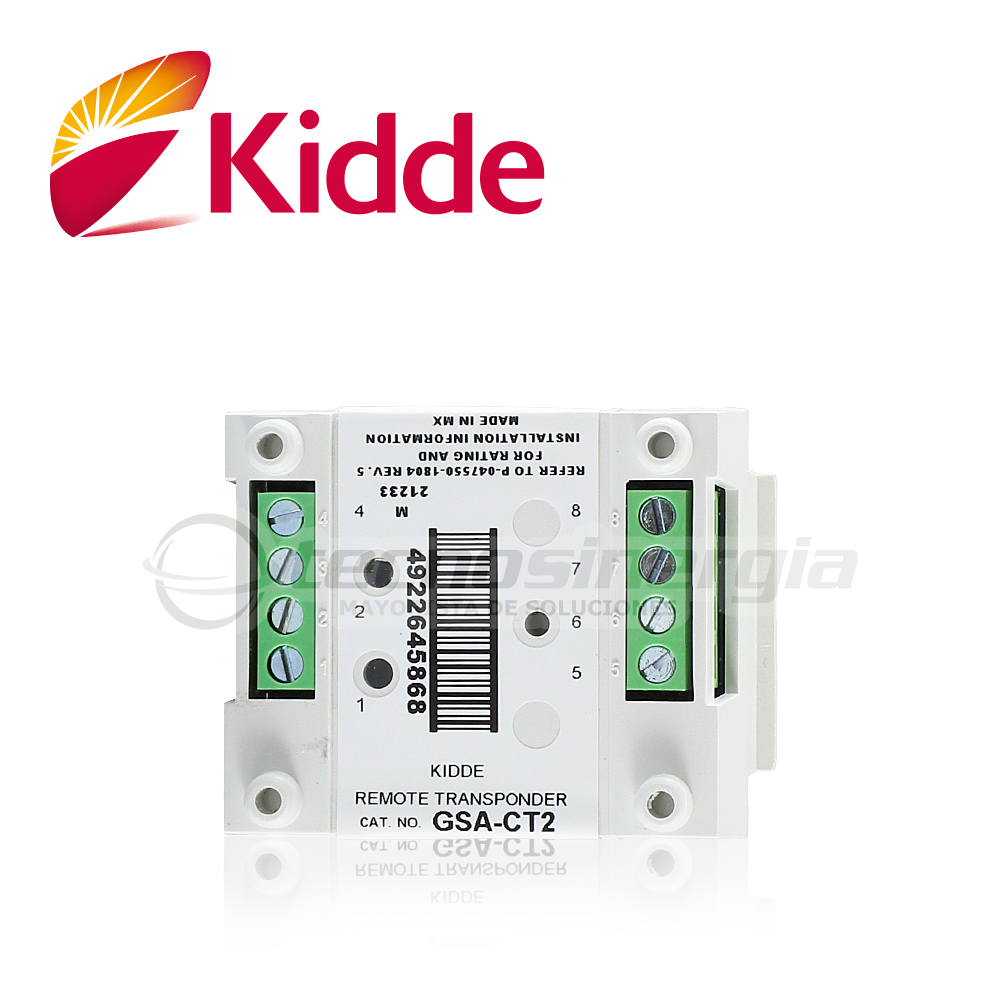 MÓDULO DE SUPERVISIÓN DE CONTACTO SECO DOBLE VIGILANT GSA-CT2 SE INTEGRA EN EL LAZO DE COMUNICACIÓN SLC DE LOS PANELES DE DETECCIÓN DE HUMO VS1 Y VS4 DE KIDDE, LISTADO UL, ULC, MEA, CSFM El módulo de entrada dual GSA-CT2 es un dispositivo direccionable que se utiliza para conectar uno o dos lazos Clase B, normalmente abierto, de alarma, supervisión o monitoreo de dispositivo de inicio de contacto seco circuitos (IDCs) a un controlador de lazo Signature. El módulo se puede usar para alarma, supervisión o monitor escriba aplicaciones dependiendo del código de personalidad asignado.El código personalizado descargado al módulo por el controlador de lazo durante la configuración del sistema determina la función del módulo. El módulo requiere dos direcciones en el circuito de línea de señalización (SLC).Las direcciones se asignan electrónicamente. No existen interruptores de dirección.Los LED de diagnóstico muestran el estado del módulo: Normal: el LED verde parpadea Alarma / activa: LED rojo flashe