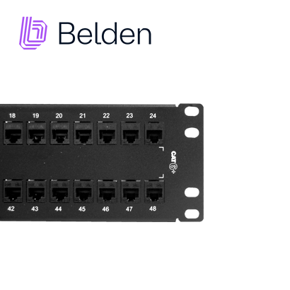 AX103255 BELDEN PATCH PANEL BELDEN PRECARGADO Cuenta con 48 puertos RJ45 listo para conectarlos. Ideal para cable UTP Cat 6. Ocupa 2 unidades de rack. Color negro. Embalaje: individualmente en una caja de cartón. Compatibilidad con Jack: RJ45 Compatibilidad de la herramienta: Herramienta de conexión Belden 110 (AX100749) Uso: Interior