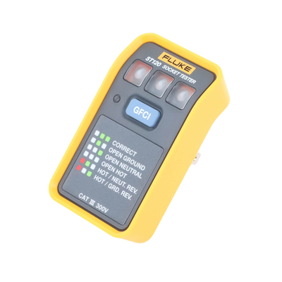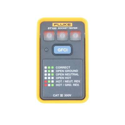 El comprobador Fluke ST120 GFCI comprueba que los cables de la toma de corriente están conectados correctamente al sistema eléctrico del edificio. Mediante los LED de alto brillo y el gráfico incluido puede verificar rápida y fácilmente el cableado de una toma de corriente. Los comprobadores ST120, capaces de identificar diferentes errores comunes de cableado, incluida la inversión de fase y neutro o la conexión abierta de tierra, le proporcionarán la máxima confianza en su próximo trabajo.