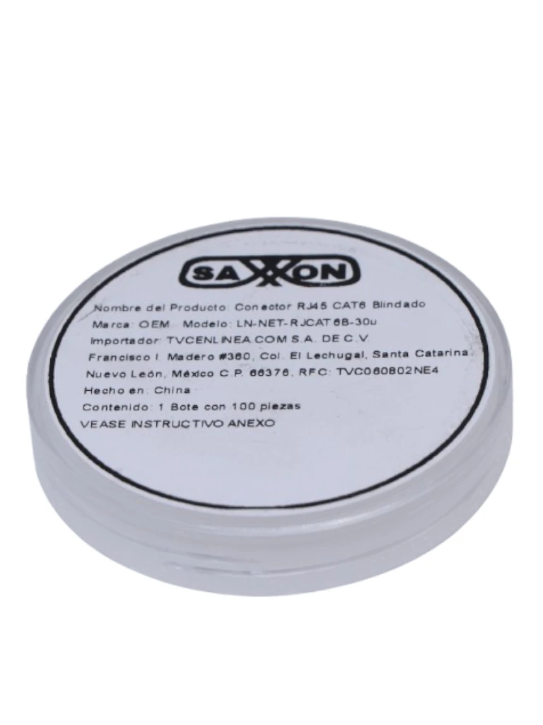 - Bote con 100 plugs RJ45 Cat6 blindados modelo TCE LN-NET-RJCAT6B-30u.