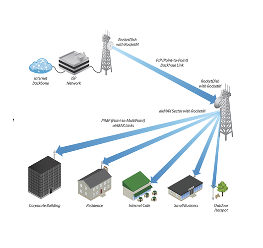 Las antenas airMAX® sector de Ubiquiti en conjunto con los equipos Rocket®M BaseStation pueden ser utilizadas para cubrir las necesidades del sector de conexiones en punto a multipunto (PtMP).