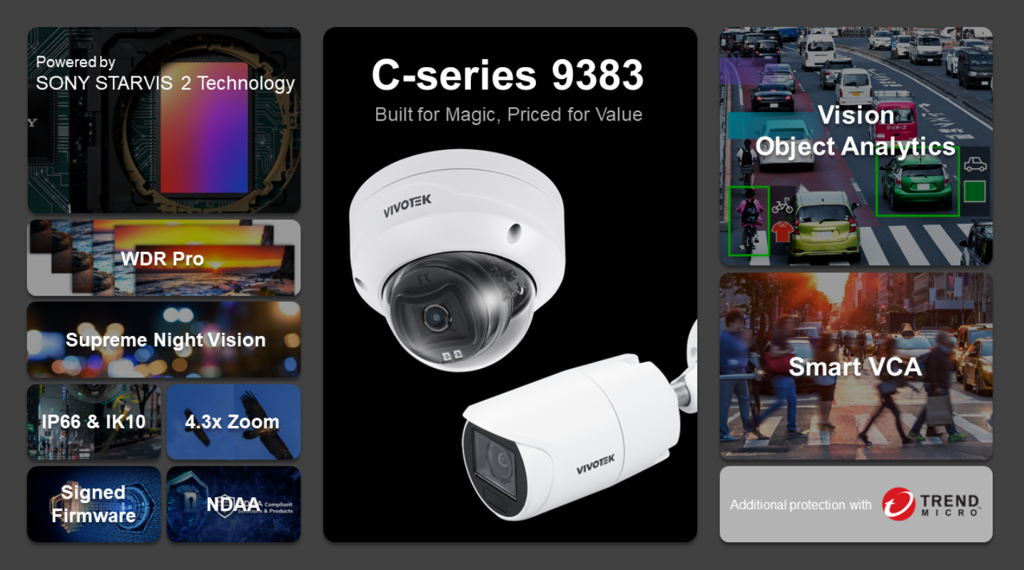 La 9383 es la puerta de entrada a una seguridad más inteligente. Es nuestra primera cámara con inteligencia artificial de la serie C y cuenta con un avanzado sensor de imagen Sony combinado con la tecnología STARVIS 2, que ofrece un rango dinámico y una sensibilidad lumínica 2,5 veces superiores. Con Smart VCA y el análisis de objetos de visión, es un potente sistema de inteligencia artificial que simplifica y hace más inteligentes y seguras sus soluciones de seguridad.